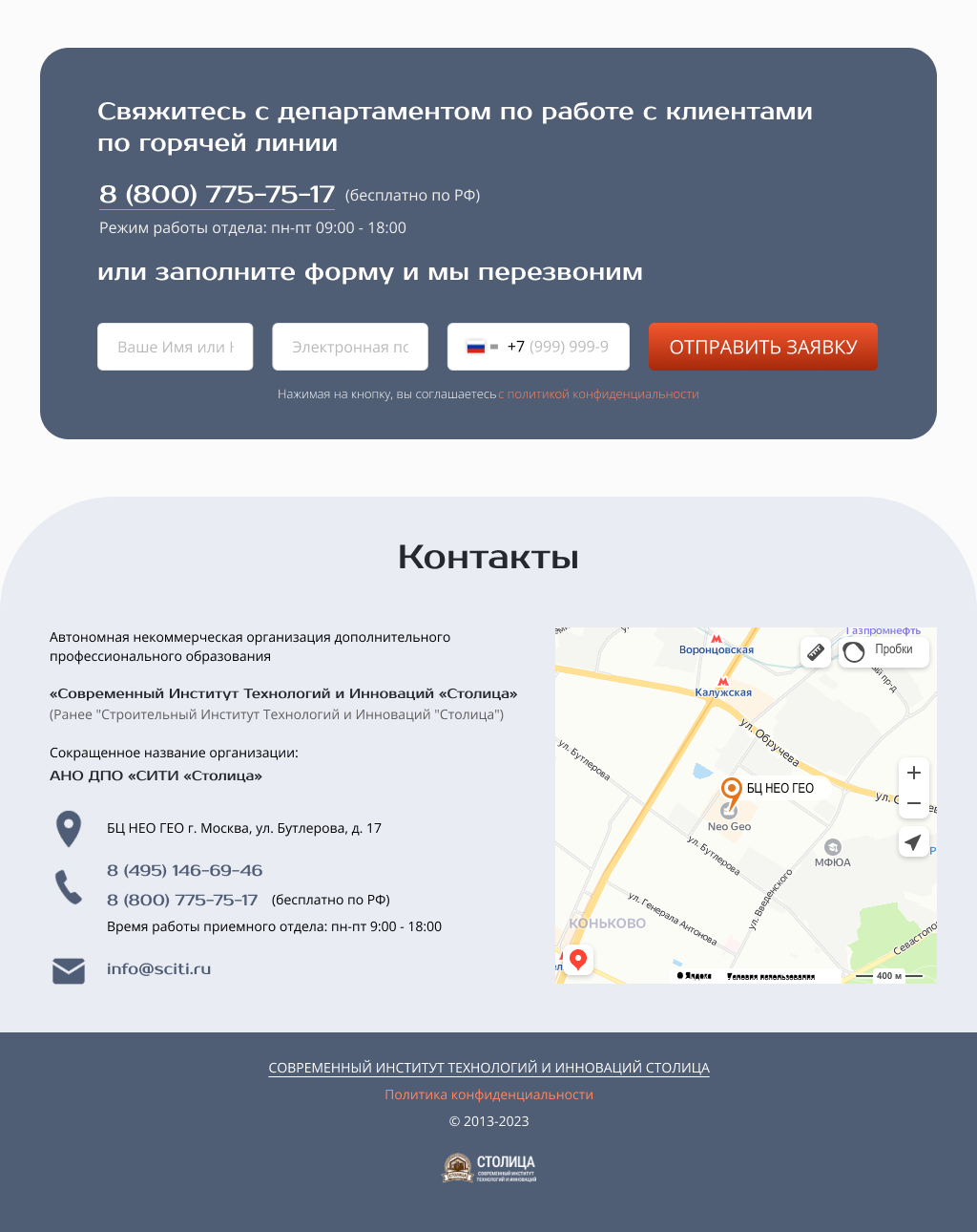 Форма обратной заявки дублирует форму из всплывающего окна, но оформлена в другом цвете. Контакты имеют кликабельные телефон и email, карта реализована с помощью HTML-кода в Zero Block.